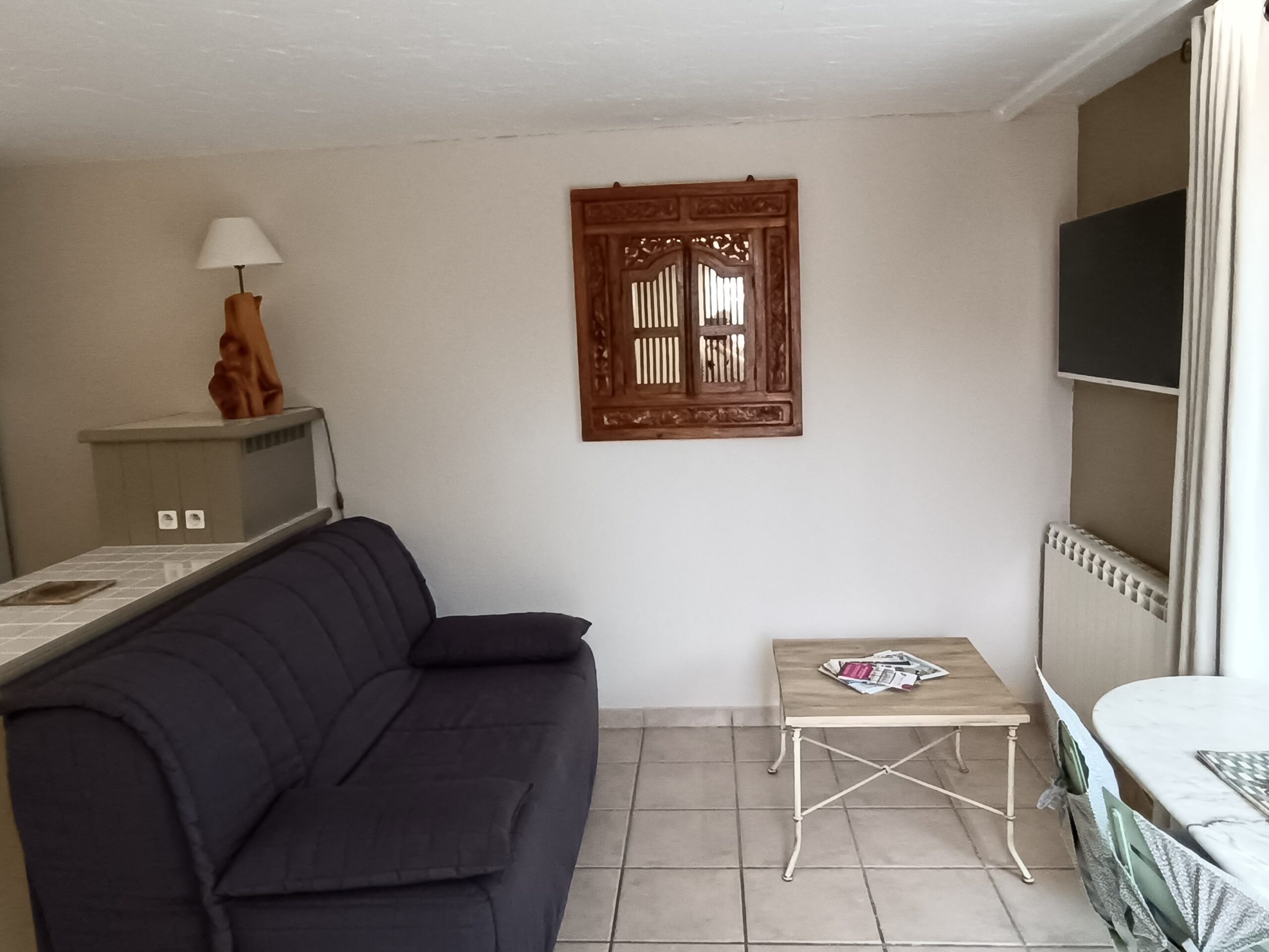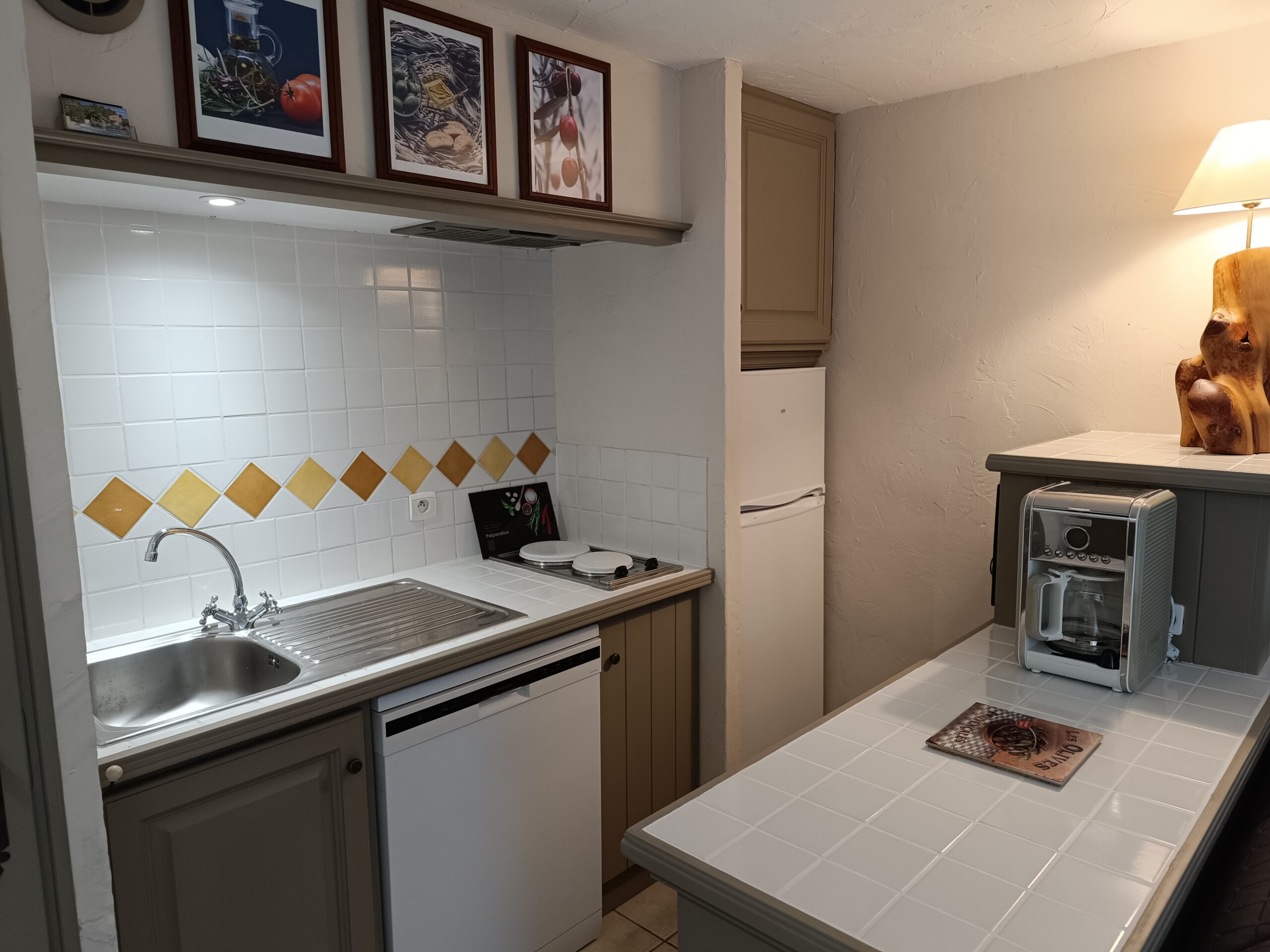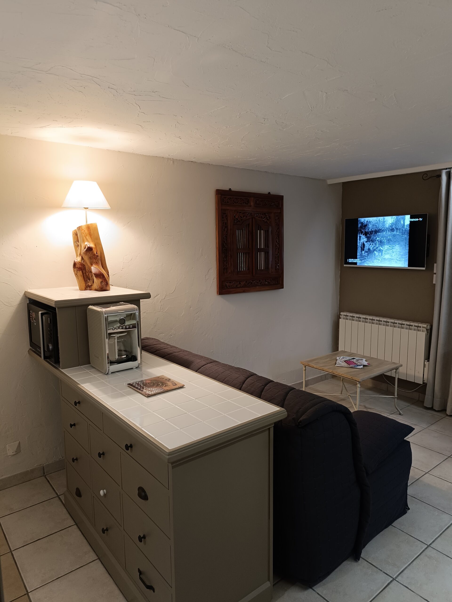 Bien équipé, le séjour en rez de jardin est meublé d’une table et de quatre chaises ainsi que d’un canapé convertible de 160 cm x 200. Le coin cuisine est doté de toute la vaisselle nécessaire, d’un frigo avec partie congélation, de 2 plaques électriques, un four multifonction micro-onde grill , une bouilloire, une cafetière à filtre. La baie coulissante du séjour ouvre sur une terrasse orientée Est et Sud, avec plancha ,salon de jardin et accès direct à la piscine. La salle d’eau située à l’étage est dotée d’une douche et d’un lavabo. Les toilettes sont séparées. Télévision et Wifi .